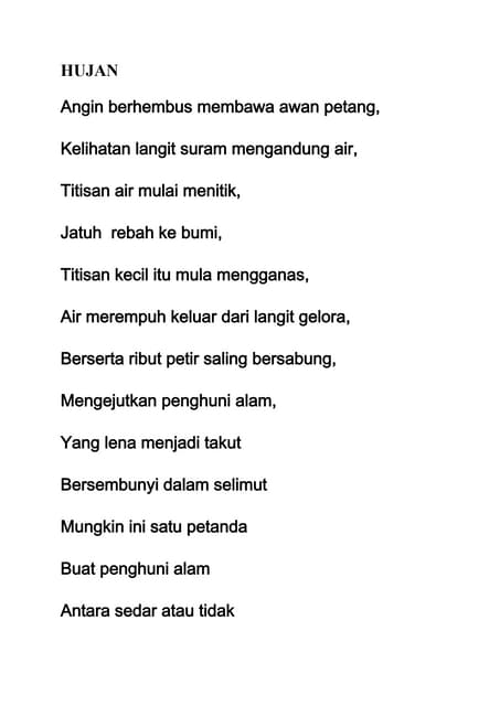 Hujan juga siklus alam yang akan terus berlangsung. Puisi tentang hujan hujan adalah fenomena alam di mana turunnya air dari langit. 8 talking about this.
